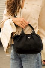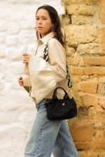 Cartera pequeña con correa ajustable. Bolsillo interior con cremallera y bolsillo para celular. Personalizada con el logo Baula en acabado dorado.